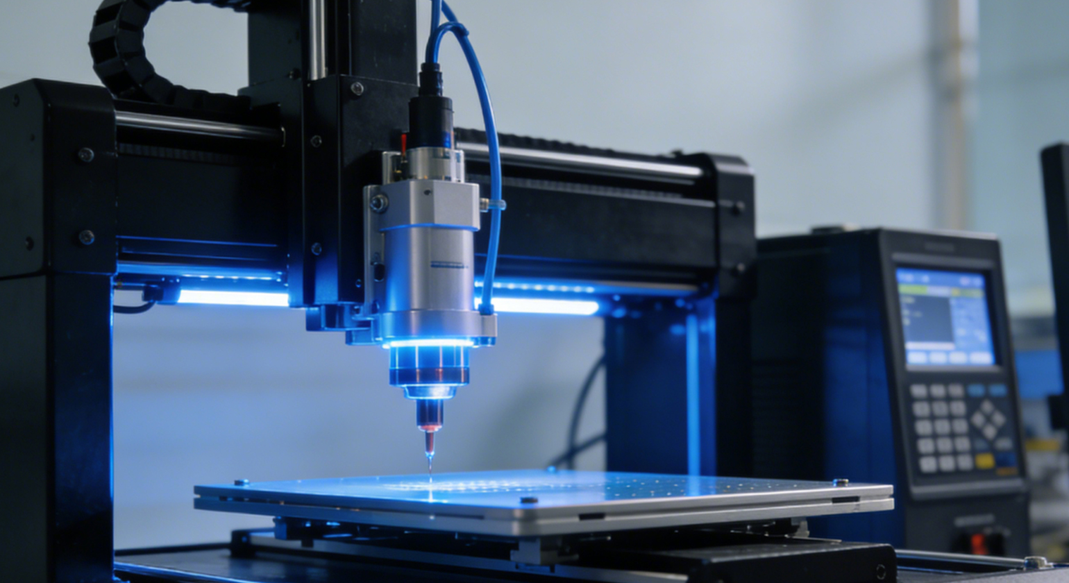 德瑞精工点胶设备(点胶平台),基于直线电机驱动的龙门式点胶平台。这种结构消除了皮带、丝杆带来的滞后和磨损,重复定位精度高,非常适合复杂图形(如手机边框涂胶)的连续轨迹运动。高速、高路径精度、胶线均匀。适用于镜头模组锁固、PCB封胶、芯片Underfill等。