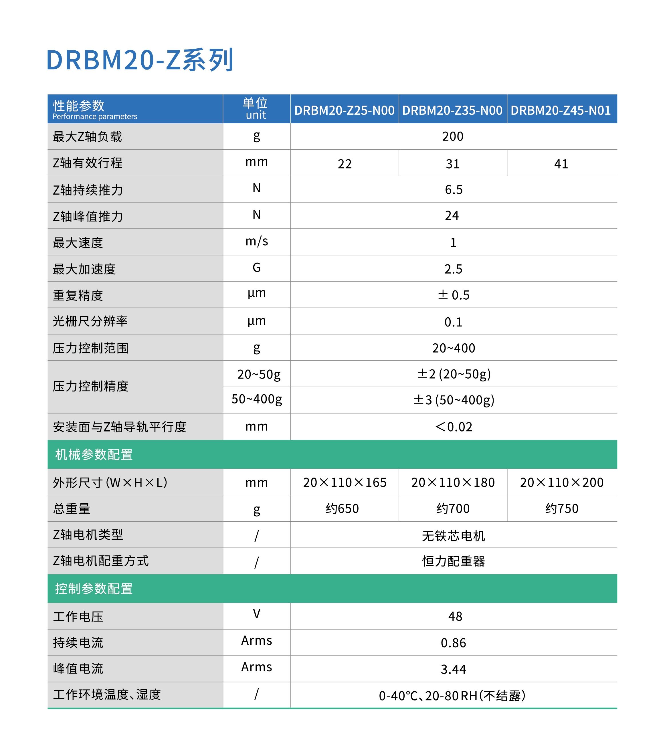 紧凑型Z+R拾取机构;Z轴定位精度2μm、重复定位精度±0.5μm;旋转轴定位精度±36arcsec,重复定位精度±6arcsec;半导体芯片的(开环力控)拾取和贴装、键盘按压测试、触控面板测试、开关检测、液体配剂量/注入、微组装(摄像头模组等微小零件、寿命/疲劳性测试;可根据客户需求定制。