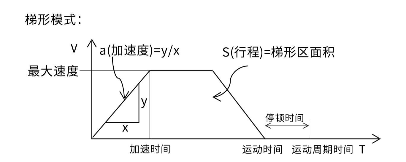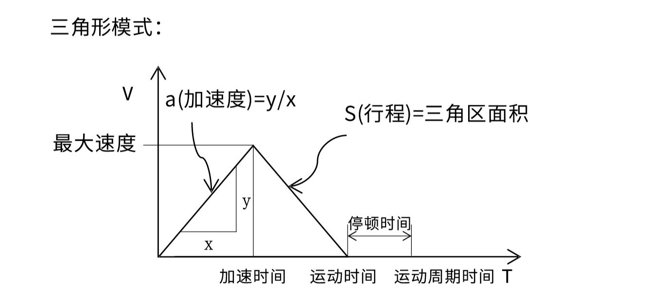 3.通常不知道实际加速度需求,但有运行时间的要求,给定运动行程和所需时间,便可计算出加速度对于短行程,推荐使用三角形速度模式(无匀速),长行程推荐梯形速度式。